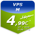 * Offre serveur dédié VPS M : prix réduit pendant le premier mois à 4.99 Euros, puis 19.99 Euros les mois suivants.