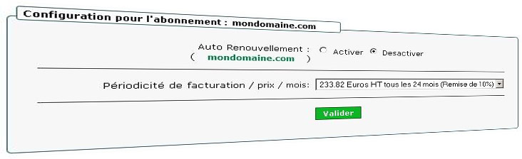 L'activation du service de renouvellement automatique vous permet de choisir la périodicité de facturation : vous pouvez choisir d'être prélevé tous les mois, ou alors tous les 6, 12, 24 mois par exemple (en fonction du service souscrit).